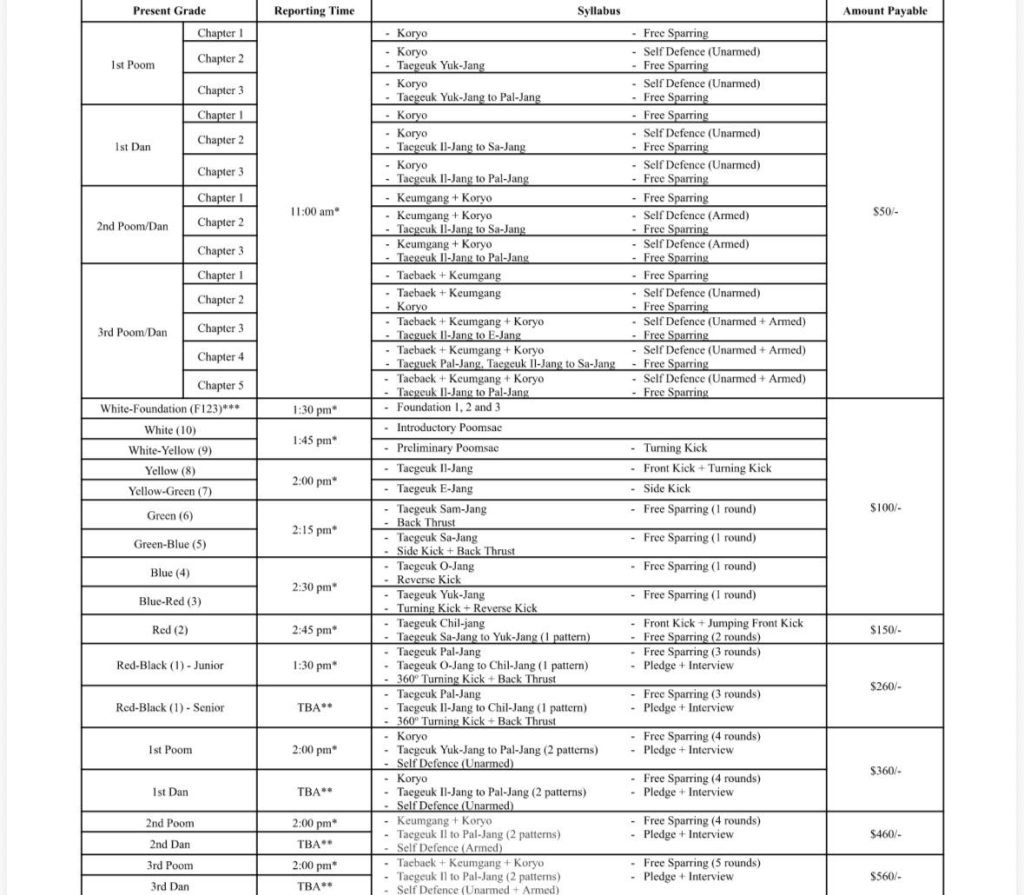 **For those taking Red-Black (1) – Senior, Ist Dan and above, grading venue, date and time will be advised by Coaches
